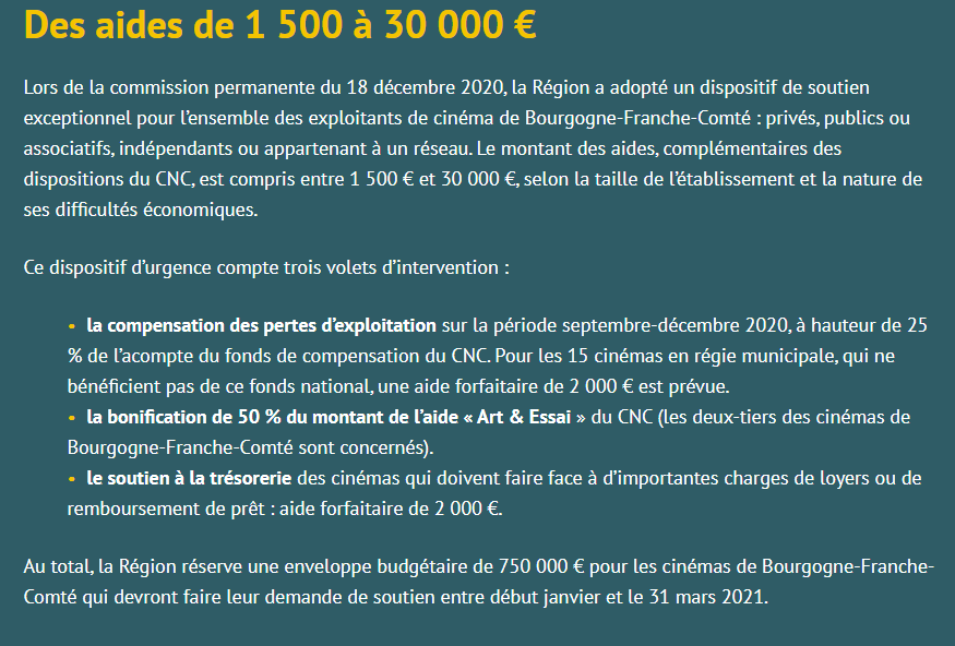 Lors de la commission permanente du 18 décembre 2020, la Région a adopté un dispositif de soutien exceptionnel pour l’ensemble des exploitants de cinéma de Bourgogne-Franche-Comté : privés, publics ou associatifs, indépendants ou appartenant à un réseau. Le montant des aides, complémentaires des dispositions du CNC, est compris entre 1 500 € et 30 000 €, selon la taille de l’établissement et la nature de ses difficultés économiques.