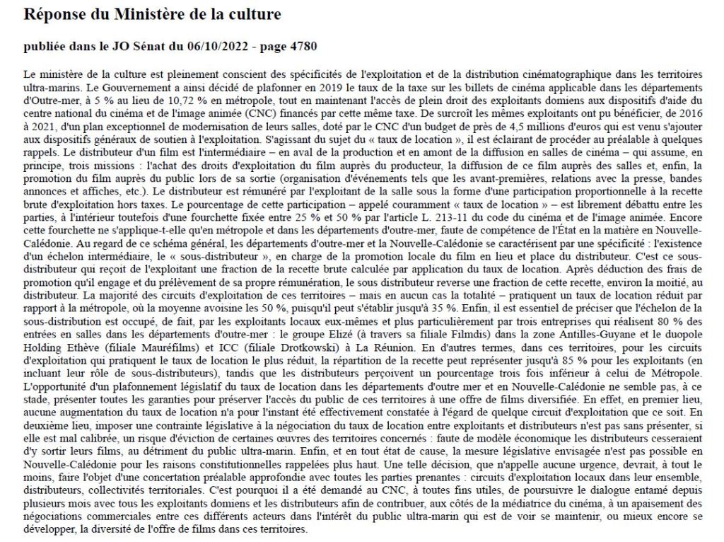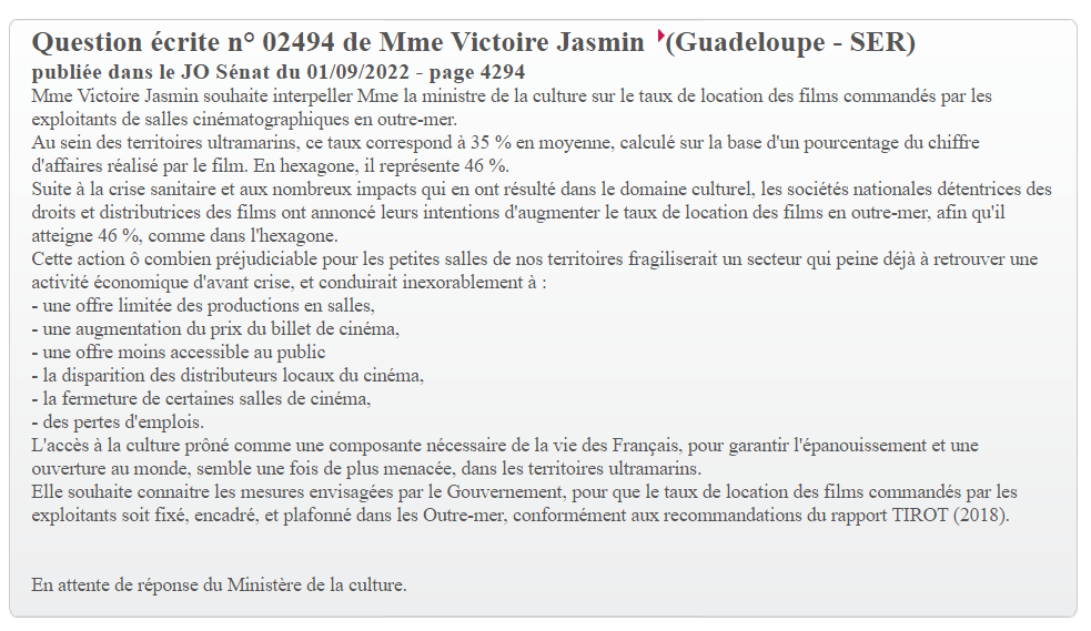 Face à la demande d’augmentation du taux de location des films pour les territoires ultramarins, Madame Victoire Jasmin, Sénatrice de Guadeloupe, interroge le Ministère de la Culture.