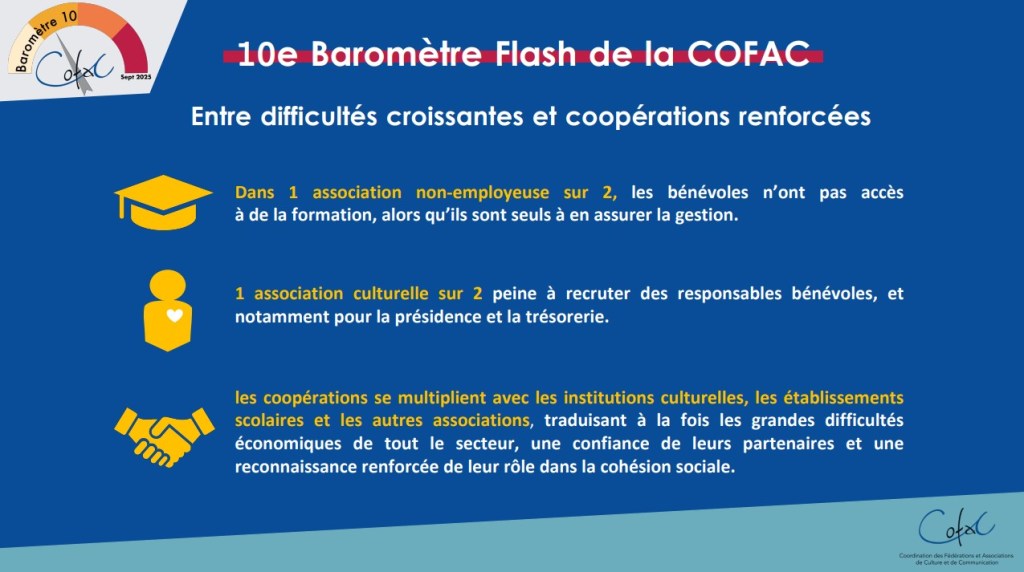 | Depuis 2021 le Baromètre Flash de la COFAC -dont Territoires et Cinéma est membre- mesure la pression sur les dirigeants des associations culturelles afin de mieux comprendre et anticiper leurs besoins. La dernière édition du Baromètre s’est tenue en ligne du 2 septembre au 15 octobre 2025 auprès des responsables d’associations culturelles. Alors que les associations culturelles font face à des difficultés croissantes, la réduction des budgets publics fragilise encore un secteur déjà sous tension. Les problèmes de gouvernance se confirment : plus de la moitié des structures employeuses peinent à renouveler leurs instances, notamment les postes de Président et de Trésorier. Contrairement aux idées reçues, les associations ont déjà largement fait évoluer leur modèle économique. Elles sont peu nombreuses parmi les non-employeuses à solliciter des subventions publiques au vu de la complexité des dossiers et des moyens insuffisants consacrés à la Culture. Beaucoup privilégient la recherche d’un équilibre autonome, souvent au prix d’un engagement bénévole renforcé et d’une grande inventivité dans la mobilisation des ressources. Face à la baisse de leurs financements, un tiers a toutefois dû augmenter ses tarifs ou cotisations, au risque d’exclure les publics les plus précaires. Dans ce contexte, nécessité faisant loi, les associations s’adaptent et sont créatives. Elles réinventent leurs actions et multiplient les coopérations : les partenariats avec les institutions culturelles, les établissements scolaires et les autres associations font un véritable bond, traduisant à la fois les grandes difficultés économiques de tout le secteur, une confiance de leurs partenaires et une reconnaissance renforcée de leur rôle dans la cohésion sociale. La vitalité du tissu associatif demeure visible sur le terrain, et de nombreuses collectivités locales, conscientes de son impact, choisissent de maintenir, voire de renforcer, leur soutien malgré leurs propres contraintes. Mais cette dynamique ne doit pas masquer la fragilité structurelle du secteur : la formation des bénévoles demeure également un enjeu majeur, en particulier dans les associations non-employeuses, où l’accès à des dispositifs de formation ou d’accompagnement reste encore trop limité ou méconnu. Le maintien de l’emploi culturel et du bénévolat dépend toujours d’un appui des pouvoirs publics clair et durable. Renforcer ce soutien, c’est investir dans la résilience du tissu associatif, dans la diversité culturelle partout sur le territoire et dans notre capacité collective à nous construire en société. |
