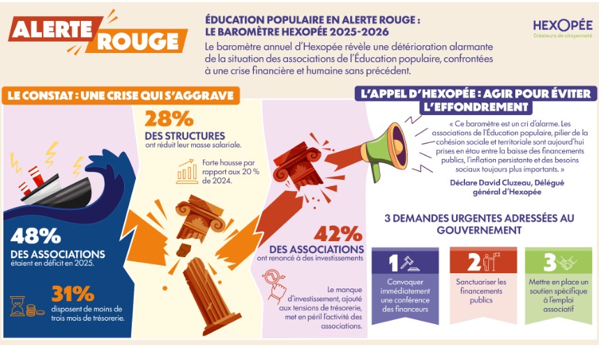 | C’est le titre du « Baromètre HEXOPEE 2025-2026 » du syndicat employeur des associations. Il nous a donc paru important de vous en faire part :« Les associations de l’Éducation populaire en alerte rouge – Une crise qui s’aggrave et menace l’avenir du secteur Hexopée », organisation professionnelle de l’Education populaire, publie aujourd’hui son baromètre annuel 2025-2026, réalisé en partenariat avec Recherches & Solidarités. Cette 6ᵉ édition, issue d’une enquête menée entre le 17 novembre 2025 et le 7 janvier 2026 auprès de 1393 adhérents employeurs, confirme et aggrave les tendances alarmantes observées dans la dernière édition. Les structures des branches ECLAT, du sport, du tourisme social & familial et de l’habitat & logement accompagné font face à des difficultés financières, humaines et structurelles sans précédent, mettant en péril leur mission d’intérêt général et la cohésion sociale. lire le communiqué de presse |