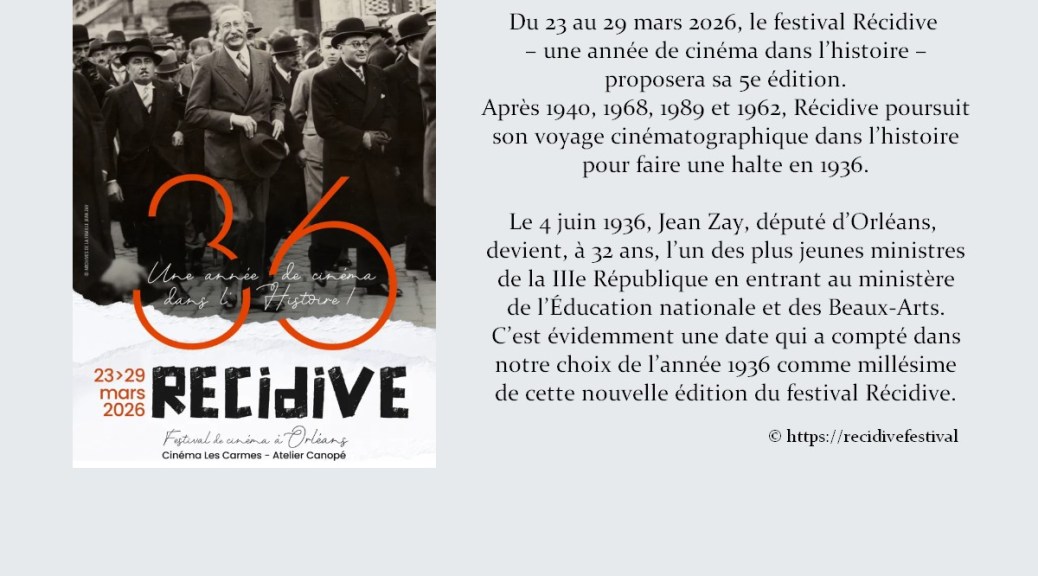 Du 23 au 29 mars 2026, au cinéma Les Carmes à Orleans, « le festival Récidive – une année de cinéma dans l’histoire » proposera sa 5e édition. Après 1940, 1968, 1989 et 1962, Récidive poursuit son voyage cinématographique dans l’histoire pour faire une halte en 1936.