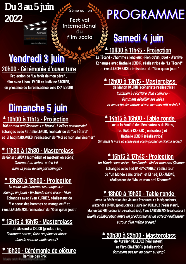 L’ASPAC (Association de Soutien aux Projets Audiovisuels et Cinématographiques) organise la 2ème édition du festival international du film social.